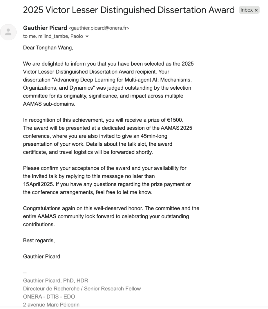 人工智能学院拟入职助理教授王同翰,荣获“Victor Lesser杰出博士论文奖(Victor Lesser Distinguished Dissertation Award)”。该奖项是智能体和多智能体系统领域给予博士毕业生的全球最高荣誉,被视为顶级学术人才的“风向标”,每年仅在全球范围内评选出极少数(通常为 1 名正式获奖者)在博士阶段对该领域作出卓越贡献的研究者。